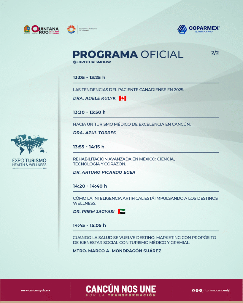 Este panel, de carácter nacional e internacional, refuerza el propósito de esta edición al generar contenido de valor, promover el networking estratégico y consolidar a Cancún como un referente regional e internacional en materia de salud y bienestar.